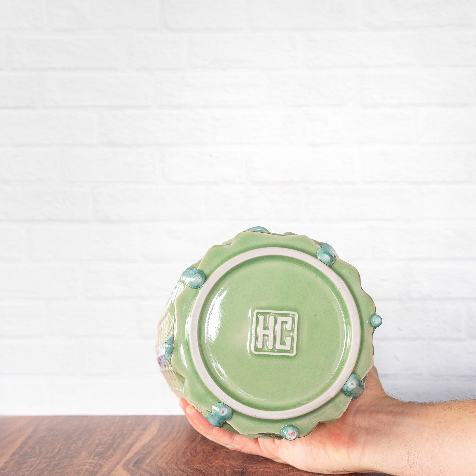 This has a slight glaze flaw on the top and is discounted.
